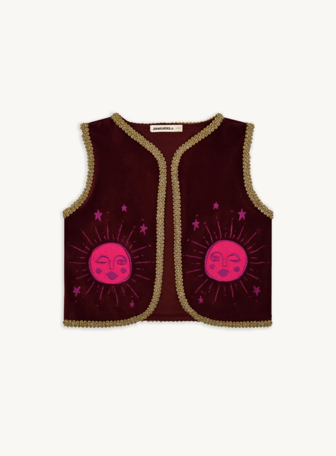 The Emmy is a rib waistcoat for women with gold details along the edgeand embroided flowers on the front.