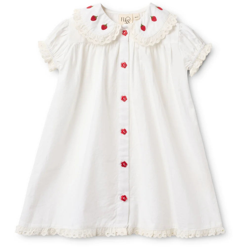 It has a Peter Pan collar with strawberry embroidery, a gathered yoke and puff sleeves. The blouse has lace details around the collar, sleeves and hem.